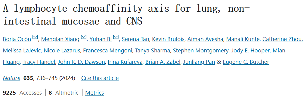 美国斯坦福大学医学院Borja Ocón,Menglan Xiang和Yuhan Bi共同合作取得了重要进展。他们研究发现了肺、非肠粘膜和中枢神经系统的淋巴细胞GPR25-CXCL17趋化亲和轴,该轴参与调控非肠道粘膜和中枢神经系统的免疫和耐受性,相关研究成果已于2024年9月18日在线发表于《Nature》。接下来将大致介绍一下这篇研究。