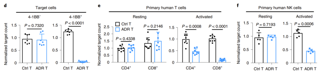 第一时间,研究者在体外将转导ADR的T细胞与人原代静息期T细胞,NK细胞以及激活后的T细胞,NK细胞共同培养,结果显示,ADR T细胞在体外能够顺利获得4-1BB选择性地消除激活的T细胞和NK细胞,而对静息期的免疫细胞并无影响(图1)。
