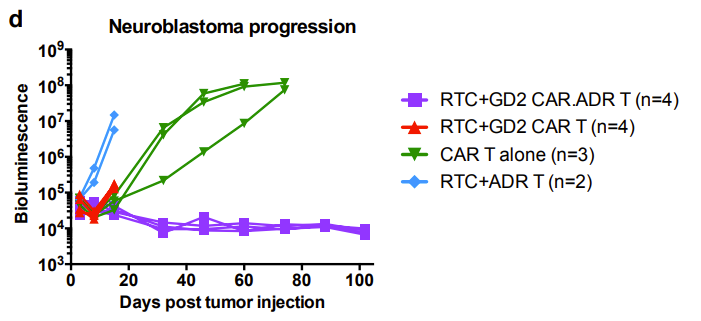 同样,研究者在小鼠异体移植模型中证明了GD2 CAR.ADR T细胞能够持续根除系统性神经母细胞瘤,并且抵抗了异体免疫系统的排斥(图6)。