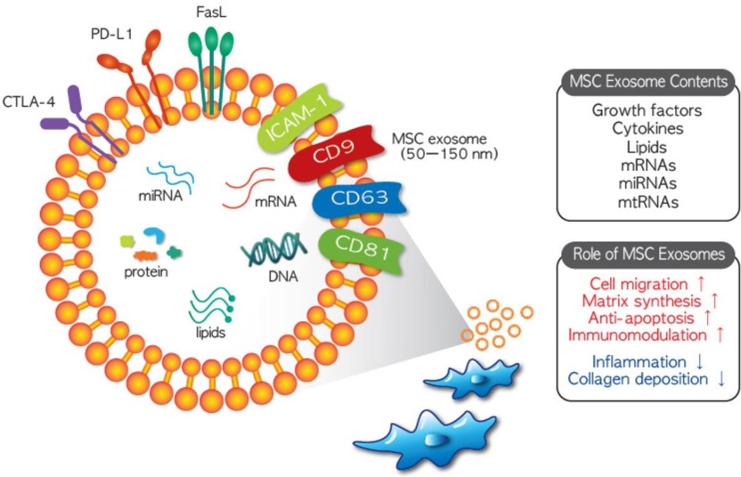 几乎所有类型的细胞都可以分泌外泌体,他们广泛存在于各种体液中,包括血液、眼泪、尿液、唾液、乳汁等。例如间充质干细胞(MSCs)分泌的外泌体在许多研究中发现其在免疫调节中有重要作用,并对受损和衰老的细胞有一定的修复和唤醒功能。