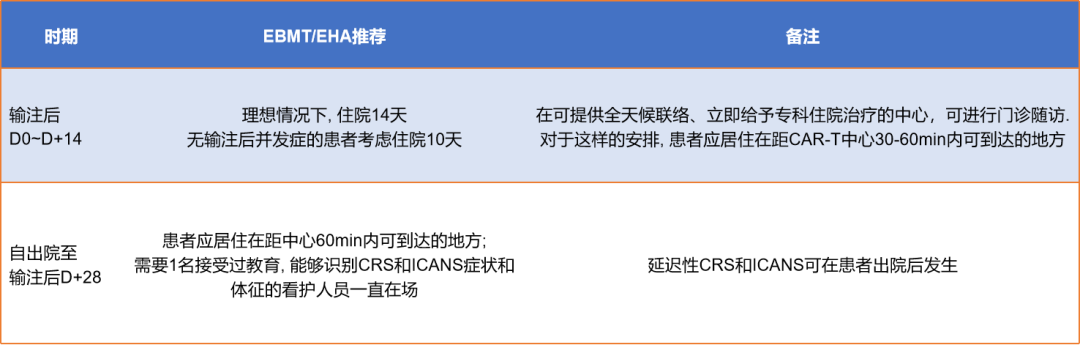 输注后的0-28天内患者的病情开展对治疗效果评价以及术后复发极为关键,欧洲血液与骨髓移植学会(EBMT)给出了便于进行观察和急救的住院及随访建议[1]